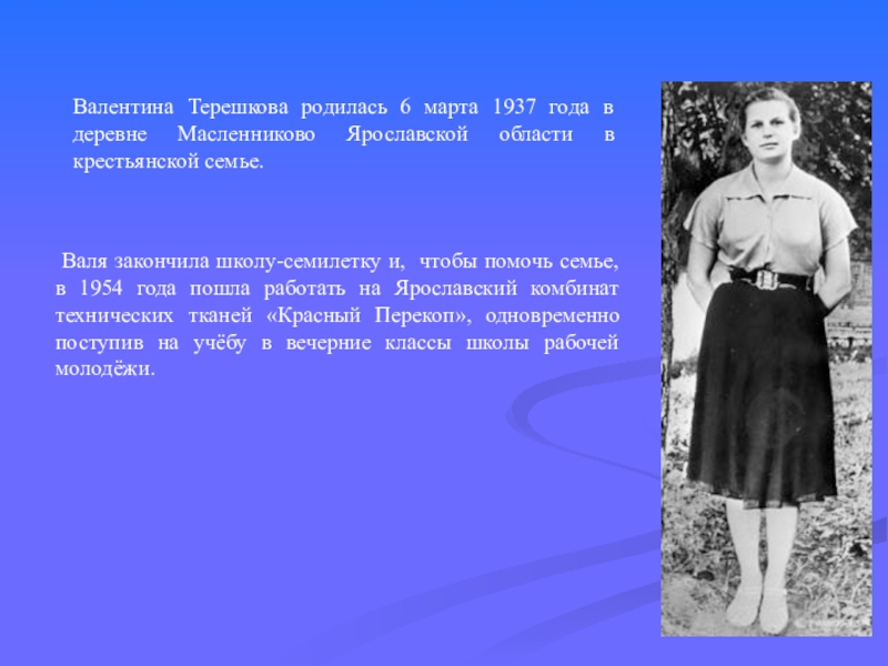 Валя закончила школу-семилетку и, чтобы помочь семье, в 1954 года пошла работать на Ярославский комбинат технических тканей «Красный Перекоп», одновременно поступив на учёбу в вечерние классы школы рабочей молодёжи.