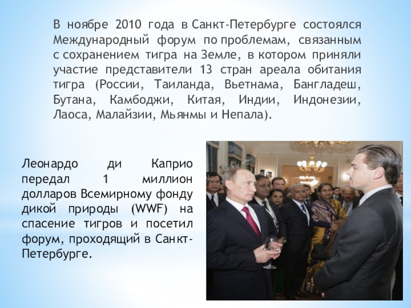Леонардо ди Каприо передал 1 миллион долларов Всемирному фонду дикой природы (WWF) на спасение тигров и посетил форум, проходящий в Санкт-Петербурге.