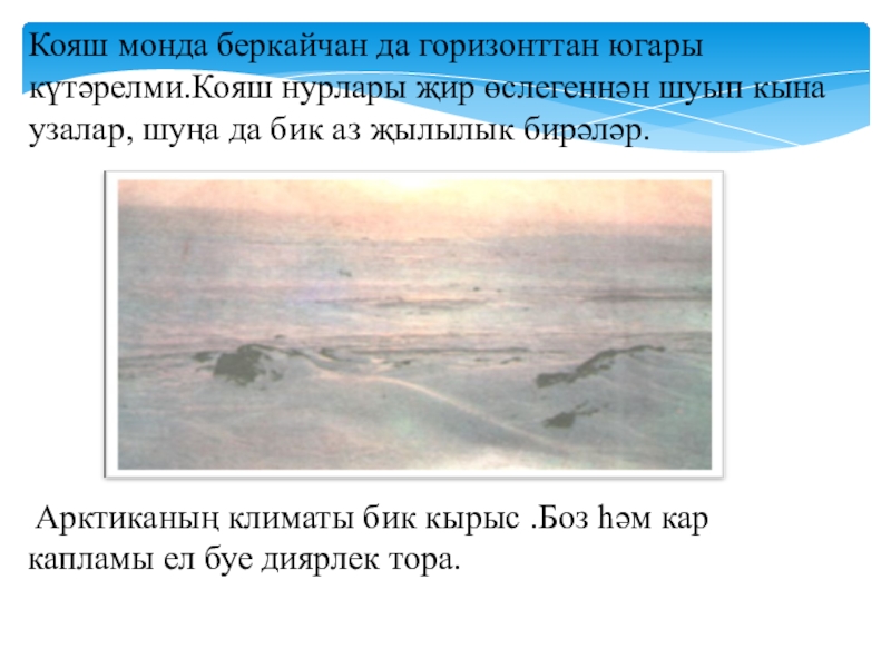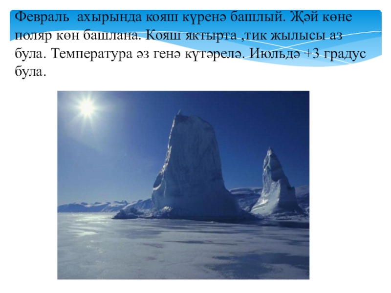 Кояш монда беркайчан да горизонттан югары күтәрелми.Кояш нурлары җир өслегеннән шуып кына узалар, шуңа да бик аз җылылык бирәләр.