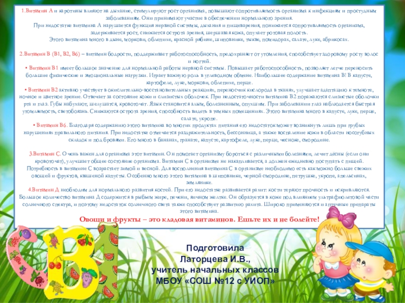 3.Витамин С. Очень важен для организма этот витамин. Он помогает организму бороться с различными болезнями, лечит дёсны (если они кровоточат), улучшает общее состояние организма. Витамин С в организме не накапливается, а должен ежедневно поступать с пищей. Потребность в витамине С возрастает зимой и весной. Для восполнения витамина С в организме необходимо есть как можно больше свежих овощей и фруктов, квашеной капусты. Особенно много этого витамина в шиповнике, черной смородине, петрушке, укропе, апельсинах, землянике.