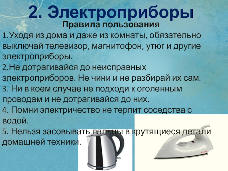 2. Электроприборы Правила пользования1.Уходя из дома и даже из комнаты, обязательно выключай телевизор, магнитофон, утюг и другие
