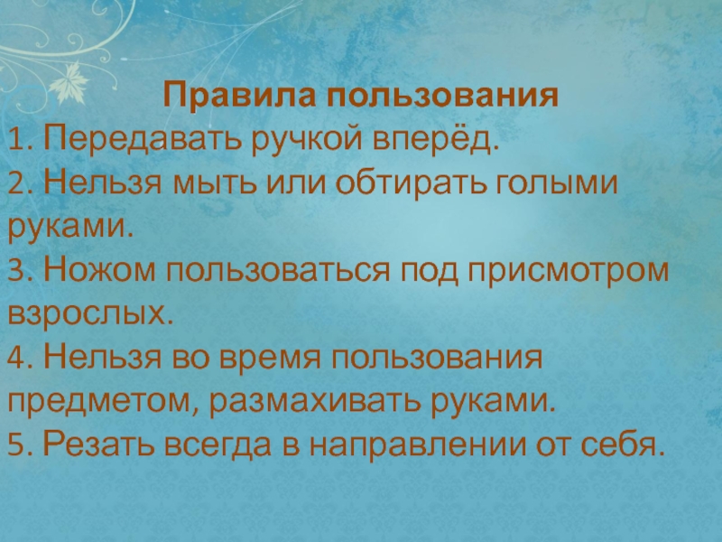 Правила пользования1. Передавать ручкой вперёд.2. Нельзя мыть или обтирать голыми руками.3. Ножом пользоваться под присмотром взрослых.4. Нельзя