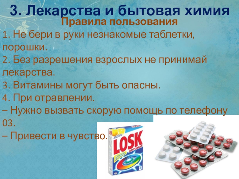 3. Лекарства и бытовая химия Правила пользования1. Не бери в руки незнакомые таблетки, порошки.2. Без разрешения взрослых