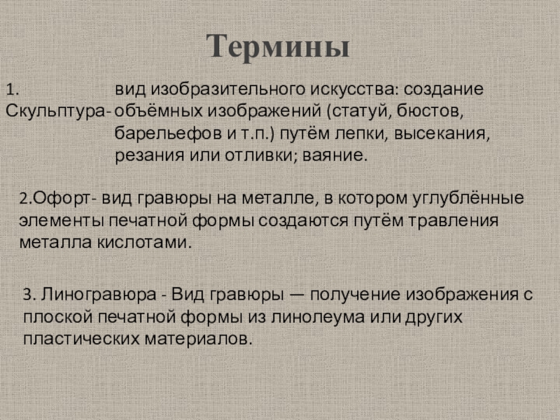 2.Офорт- вид гравюры на металле, в котором углублённые элементы печатной формы создаются путём травления металла кислотами.