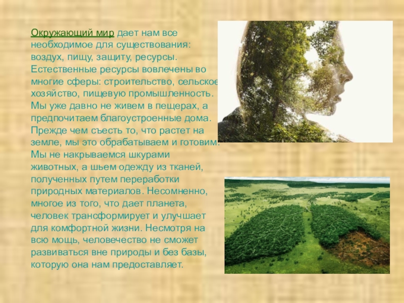 Слайд 4Окружающий мир дает нам все необходимое для существования: воздух, пищу, защиту,