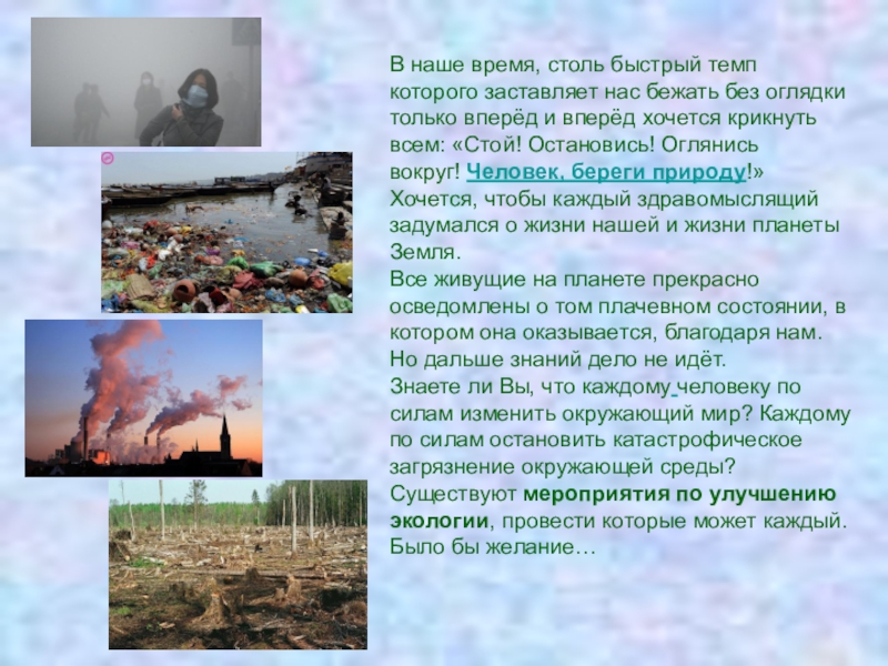 Знаете ли Вы, что каждому человеку по силам изменить окружающий мир? Каждому по силам остановить катастрофическое загрязнение окружающей среды? Существуют мероприятия по улучшению экологии, провести которые может каждый. Было бы желание…