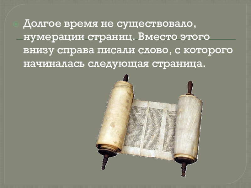 Слайд 7Долгое время не существовало, нумерации страниц. Вместо этого внизу справа писали