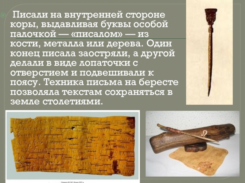 «писалом» — из кости, металла или дерева. Один конец писала заостряли, а другой делали в виде лопаточки с отверстием и подвешивали к поясу. Техника письма на бересте позволяла текстам сохраняться в земле столетиями.