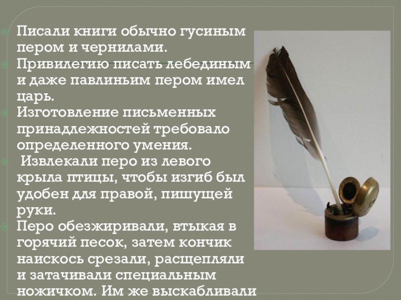 Слайд 9Писали книги обычно гусиным пером и чернилами.