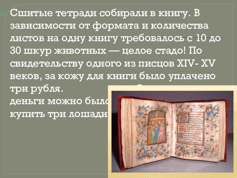 листов на одну книгу требовалось с 10 до 30 шкур животных — целое стадо! По свидетельству одного из писцов ХIV- XV веков, за кожу для книги было уплачено три рубля. В то время на эти деньги можно было купить три лошади.