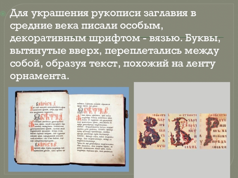 Слайд 5Для украшения рукописи заглавия в средние века писали особым, декоративным шрифтом
