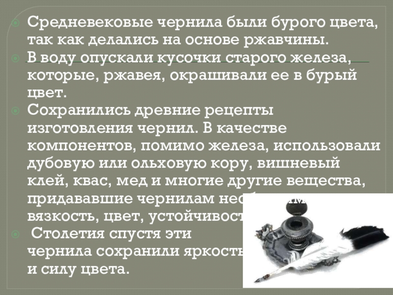 Слайд 10Средневековые чернила были бурого цвета, так как делались на основе ржавчины.