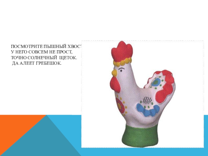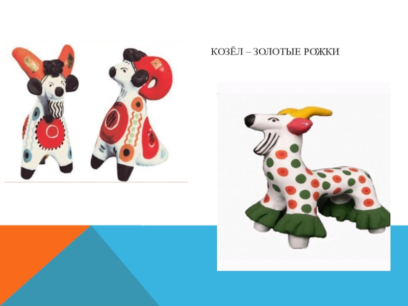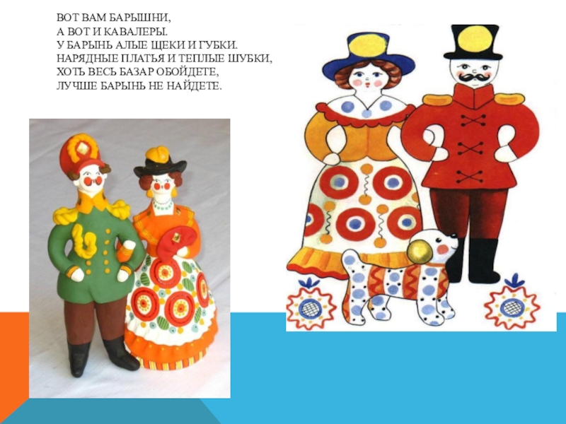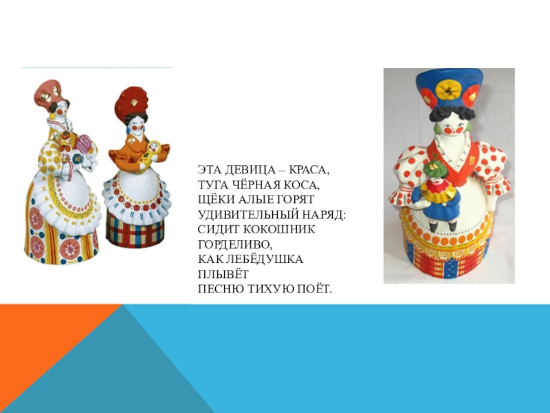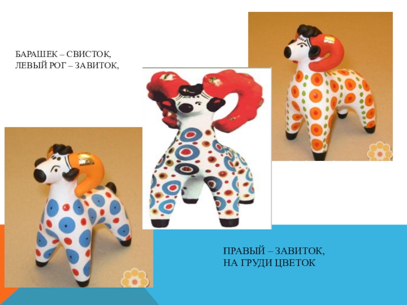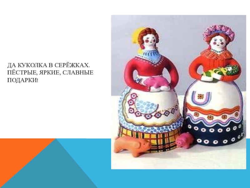 Слайд 20Характерной чертой дымковской игрушки стали пышные воротники, оборки, яркий геометрический орнамент.