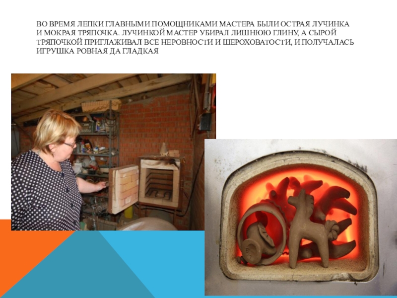 Слайд 10Во время лепки главными помощниками мастера были острая лучинка и мокрая