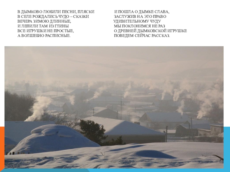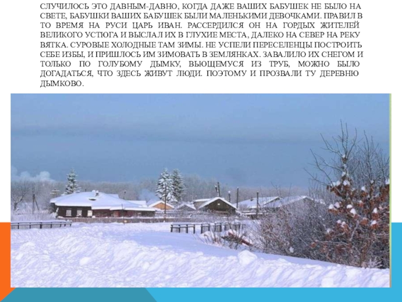 бабушки ваших бабушек были маленькими девочками. Правил в то время на Руси царь Иван. Рассердился он на гордых жителей Великого Устюга и выслал их в глухие места, далеко на север на реку Вятка. Суровые холодные там зимы. Не успели переселенцы построить себе избы, и пришлось им зимовать в землянках. Завалило их снегом и только по голубому дымку, вьющемуся из труб, можно было догадаться, что здесь живут люди. Поэтому и прозвали ту деревню Дымково.