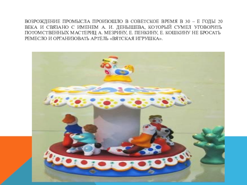 20 века и связано с именем а. и. денышева, который сумел уговорить потомственных мастериц а. мезрину, е. пенкину, е. кошкину не бросать ремесло и организовать артель «вятская игрушка».