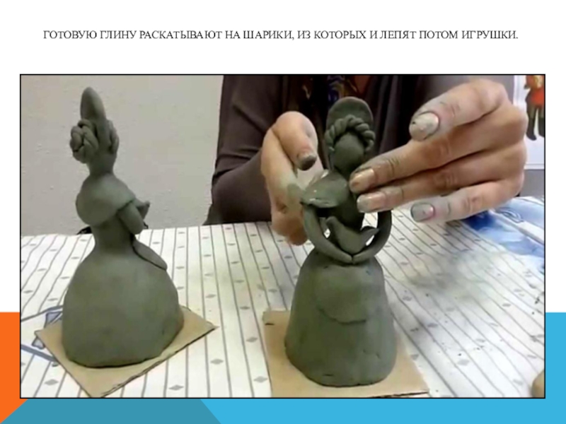 Слайд 9Готовую глину раскатывают на шарики, из которых и лепят потом игрушки.