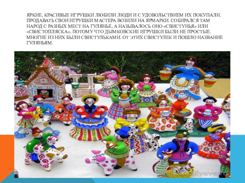 свои игрушки мастера возили на ярмарки. Собирался там народ с разных мест на гулянье, а называлось оно «Свистунья» или «Свистопляска», потому что дымковские игрушки были не простые. Многие из них были свистульками. От этих свистулек и пошло название гуляньям.