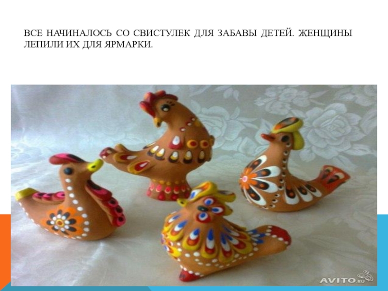 Слайд 18Все начиналось со свистулек для забавы детей. Женщины лепили их для