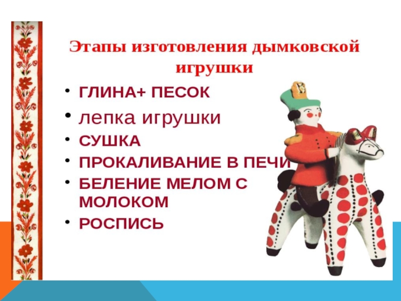 русской печи 3-4 часа. Потом мастера «обеливали» игрушку, то есть разводили мел в молоке и опускали туда игрушку, а затем ставили её на сквозняк. Красная глиняная игрушка становилась белой и была готова к росписи.
