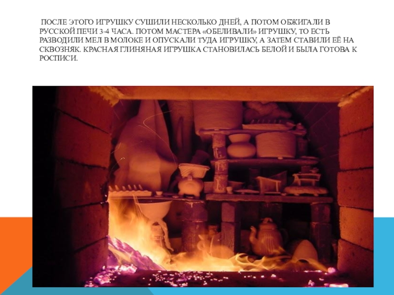 Слайд 11 После этого игрушку сушили несколько дней, а потом обжигали в