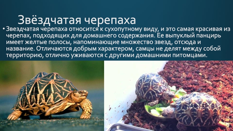 из черепах, подходящих для домашнего содержания. Ее выпуклый панцирь имеет желтые полосы, напоминающие множество звезд, отсюда и название. Отличаются добрым характером, самцы не делят между собой территорию, отлично уживаются с другими домашними питомцами.