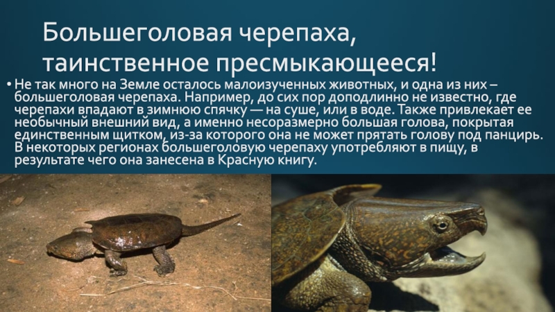 Слайд 5Большеголовая черепаха, таинственное пресмыкающееся!
