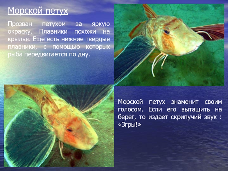 Морской петух знаменит своим голосом. Если его вытащить на берег, то издает скрипучий звук : «Згры!»
