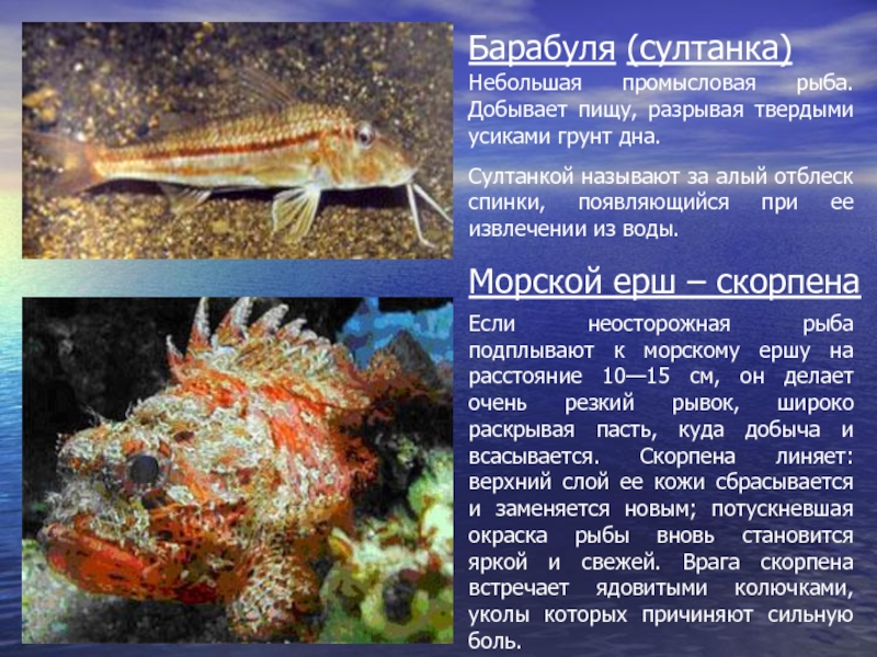 Если неосторожная рыба подплывают к морскому ершу на расстояние 10—15 см, он делает очень резкий рывок, широко раскрывая пасть, куда добыча и всасывается. Скорпена линяет: верхний слой ее кожи сбрасывается и заменяется новым; потускневшая окраска рыбы вновь становится яркой и свежей. Врага скорпена встречает ядовитыми колючками, уколы которых причиняют сильную боль.