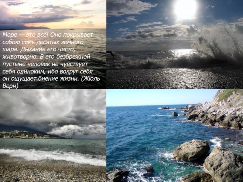 Море — это всё! Оно покрывает собою семь десятых земного шара. Дыхание его чисто, животворно. В его безбрежной пустыне человек не чувствует себя одиноким, ибо вокруг себя он ощущает биение жизни. (Жюль Верн)