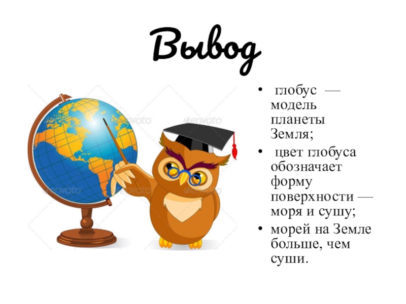 Вывод глобус — модель планеты Земля; цвет глобуса обозначает форму поверхности — моря и сушу;морей на Земле