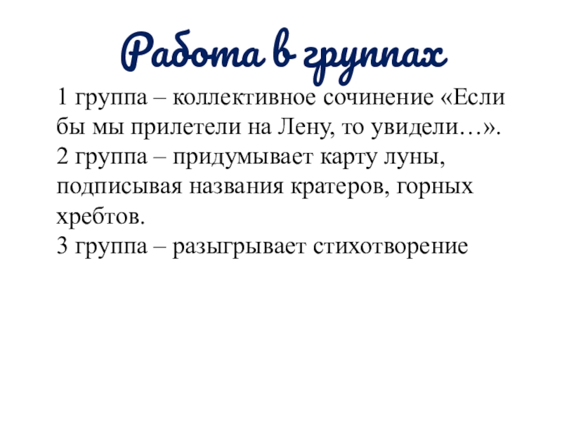 Работа в группах1 группа – коллективное сочинение «Если бы мы прилетели на Лену, то увидели…». 2 группа
