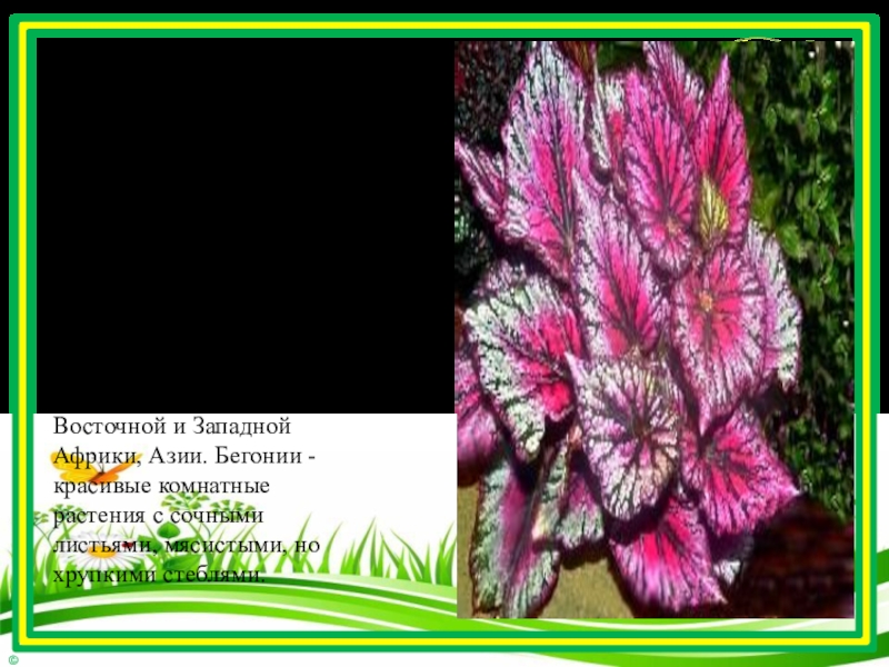 - тропические и субтропические районы преимущественно Южной Америки, Восточной и Западной Африки, Азии. Бегонии - красивые комнатные растения с сочными листьями, мясистыми, но хрупкими стеблями.