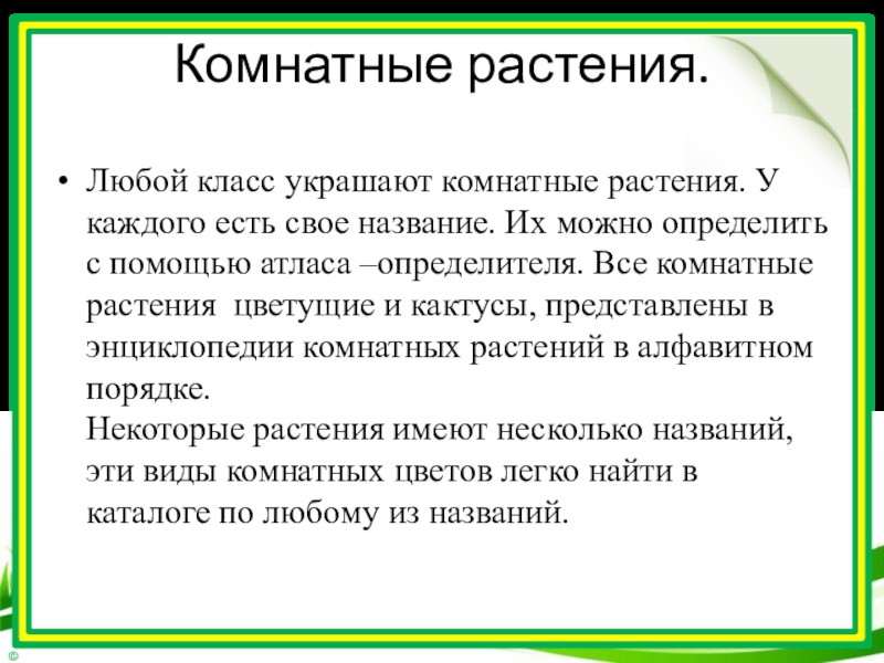 Комнатные растения.Любой класс украшают комнатные растения. У каждого есть свое название. Их можно определить с помощью атласа