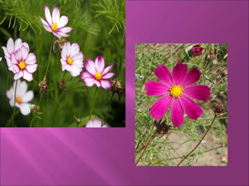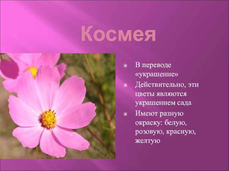 КосмеяВ переводе «украшение»Действительно, эти цветы являются украшением садаИмеют разную окраску: белую, розовую, красную, желтую