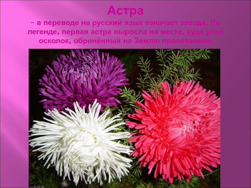 Слайд 10 Астра – в переводе на русский язык означает звезда. По легенде,