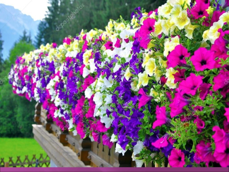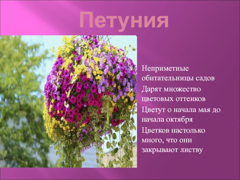 ПетунияНеприметные обитательницы садовДарят множество цветовых оттенковЦветут о начала мая до начала октябряЦветков настолько много, что они закрывают