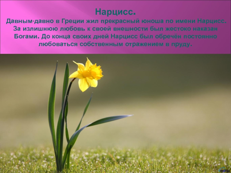 Слайд 25Нарцисс. Давным-давно в Греции жил прекрасный юноша по имени Нарцисс. За