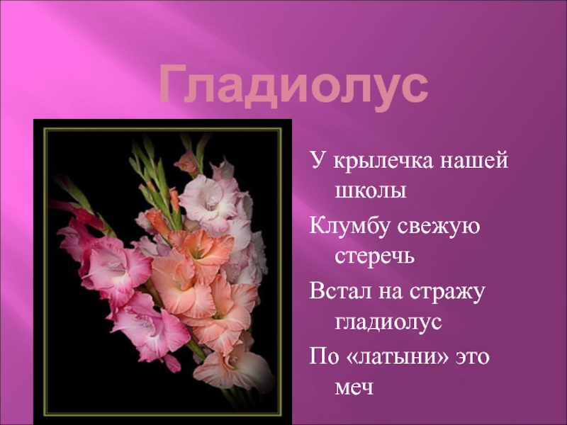 ГладиолусУ крылечка нашей школыКлумбу свежую стеречьВстал на стражу гладиолусПо «латыни» это меч