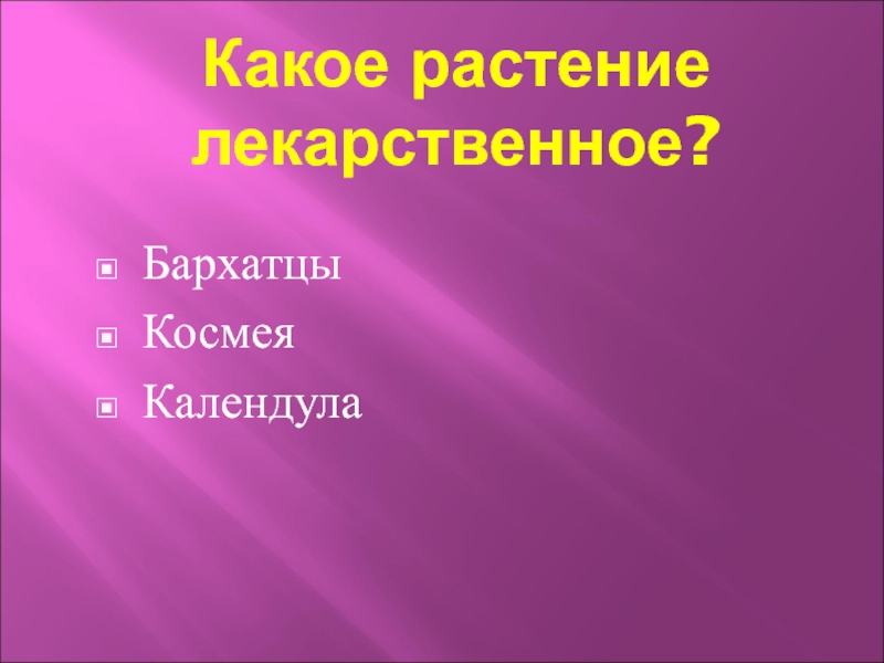 Какое растение лекарственное?БархатцыКосмеяКалендула