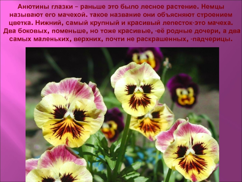Анютины глазки – раньше это было лесное растение. Немцы называют его мачехой. такое название они объясняют строением