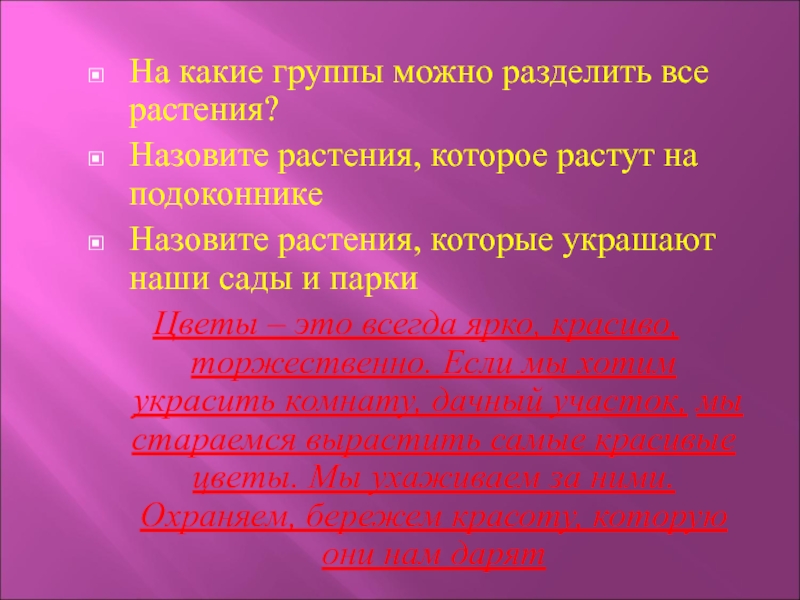 На какие группы можно разделить все растения?Назовите растения, которое растут на подоконникеНазовите растения, которые украшают наши сады