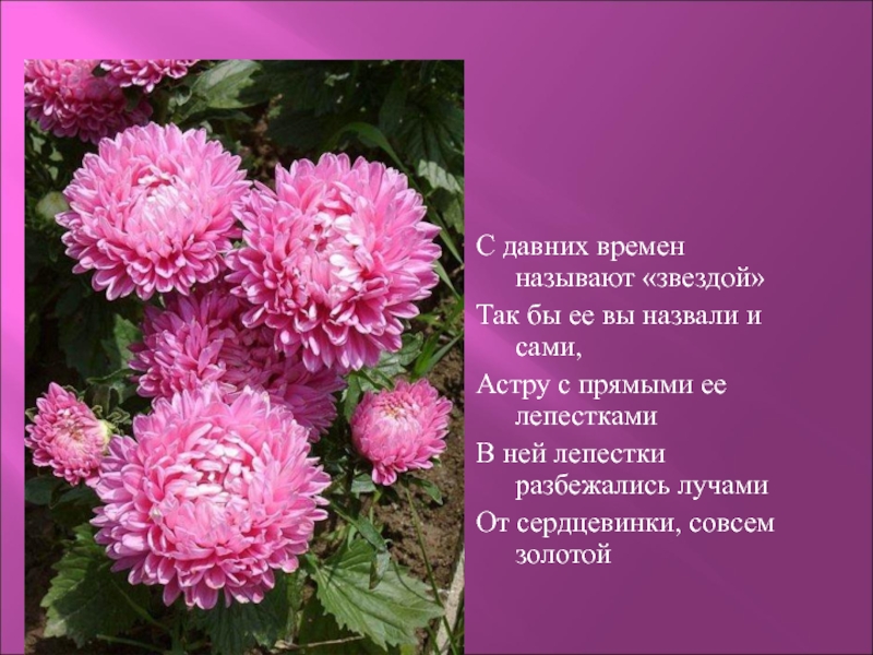 С давних времен называют «звездой»Так бы ее вы назвали и сами,Астру с прямыми ее лепесткамиВ ней лепестки