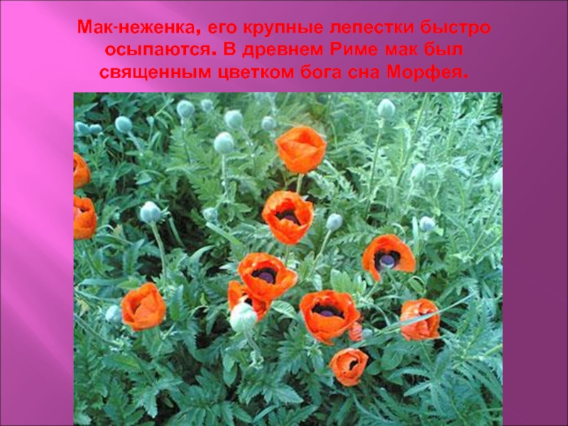 Слайд 8Мак-неженка, его крупные лепестки быстро осыпаются. В древнем Риме мак был