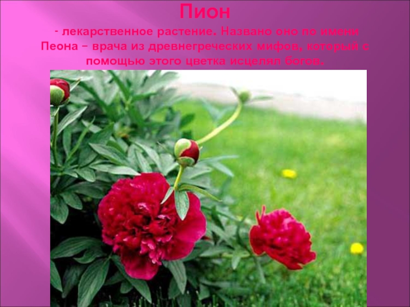Слайд 6Пион - лекарственное растение. Названо оно по имени Пеона – врача