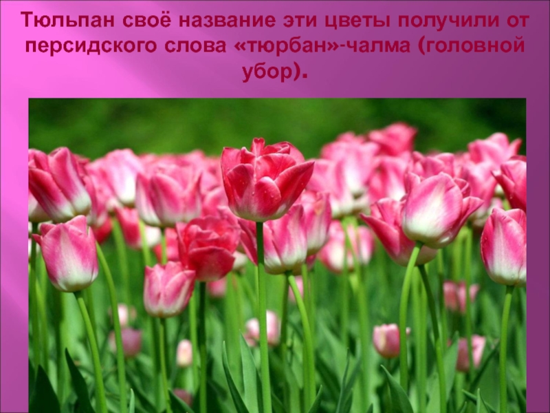 Слайд 2Тюльпан своё название эти цветы получили от персидского слова «тюрбан»-чалма (головной