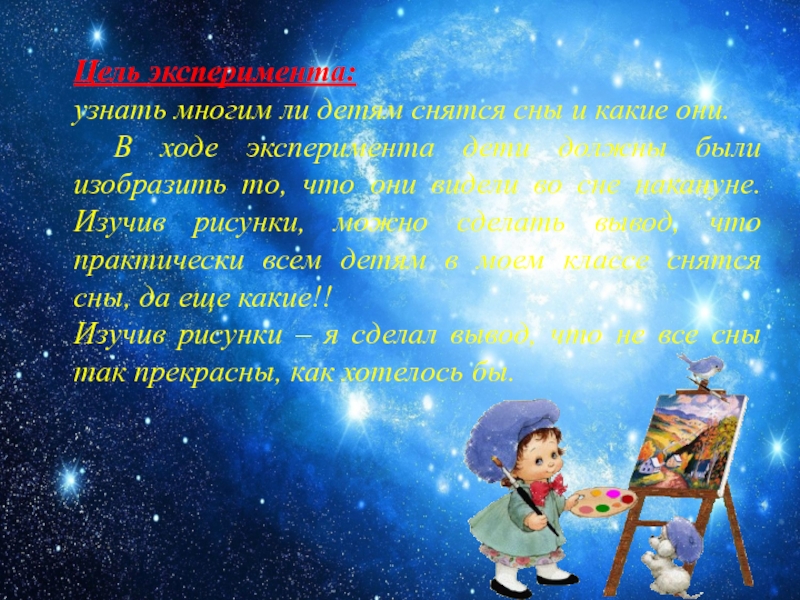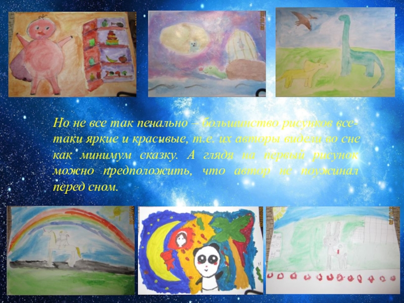 эксперимента дети должны были изобразить то, что они видели во сне накануне. Изучив рисунки, можно сделать вывод, что практически всем детям в моем классе снятся сны, да еще какие!!