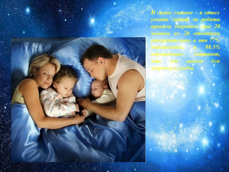 здорового сна: 20 человек из 26 ответили утвердительно, а это 77% опрошенных, а 88.5% опрошенных считают, что сон важен для здоровья и учебы.