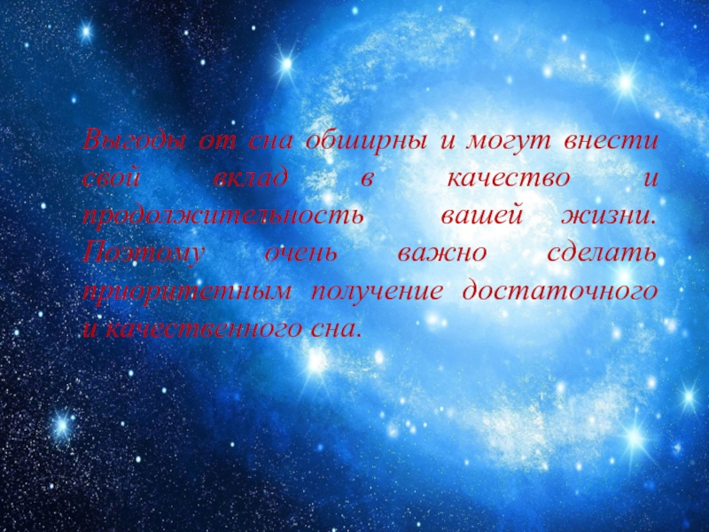 Слайд 13Выгоды от сна обширны и могут внести свой вклад в качество