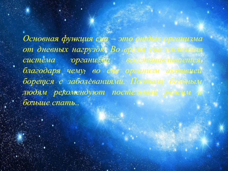 Слайд 7Основная функция сна – это отдых организма от дневных нагрузок. Во